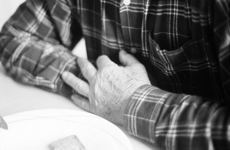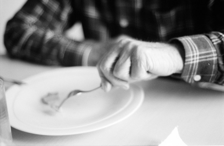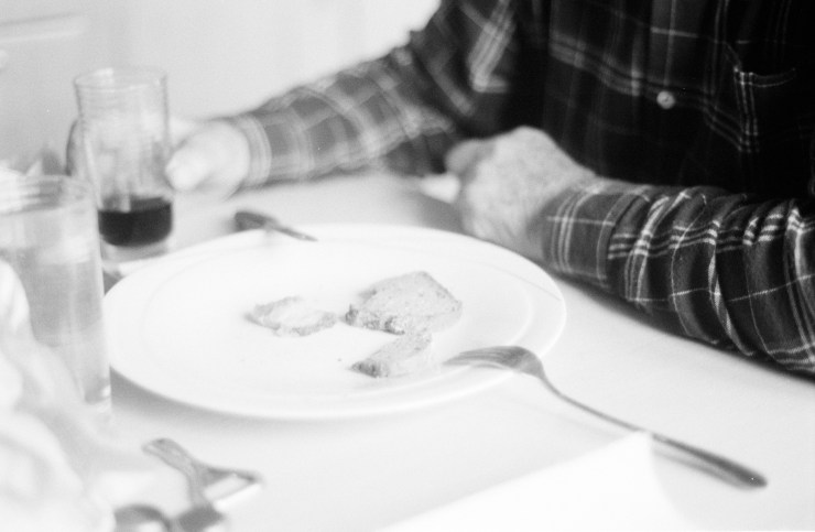Wie er die Brotscheibe in kleine Stücke zerteilt, bevor er sie zu seinem Mund führt.