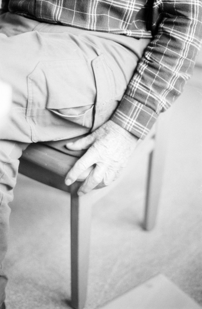 Wie er sich mit seiner Hand an der einen Seite seines Stuhls festhält.
